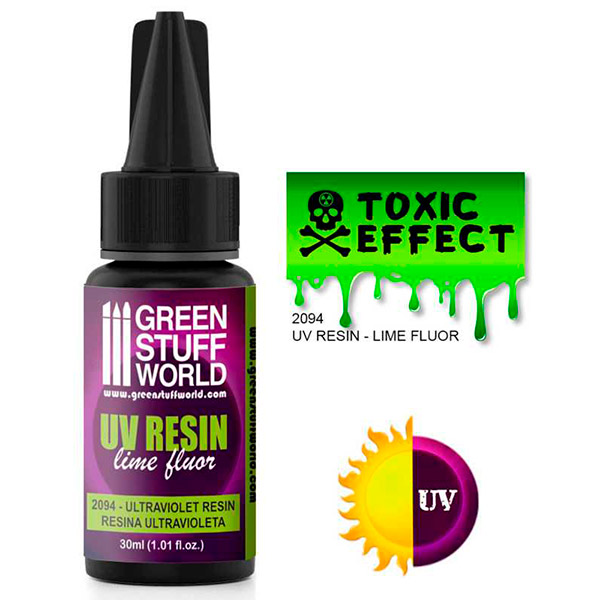Sammensat med Lime Fluor har dette produkt de samme egenskaber som vores Water Effect, men har en radioaktiv grøn farve, perfekt til at skabe fluorescerende giftige stoffer eller atomaffald. Kan bruges alene eller med normal transparent UV-harpiks.